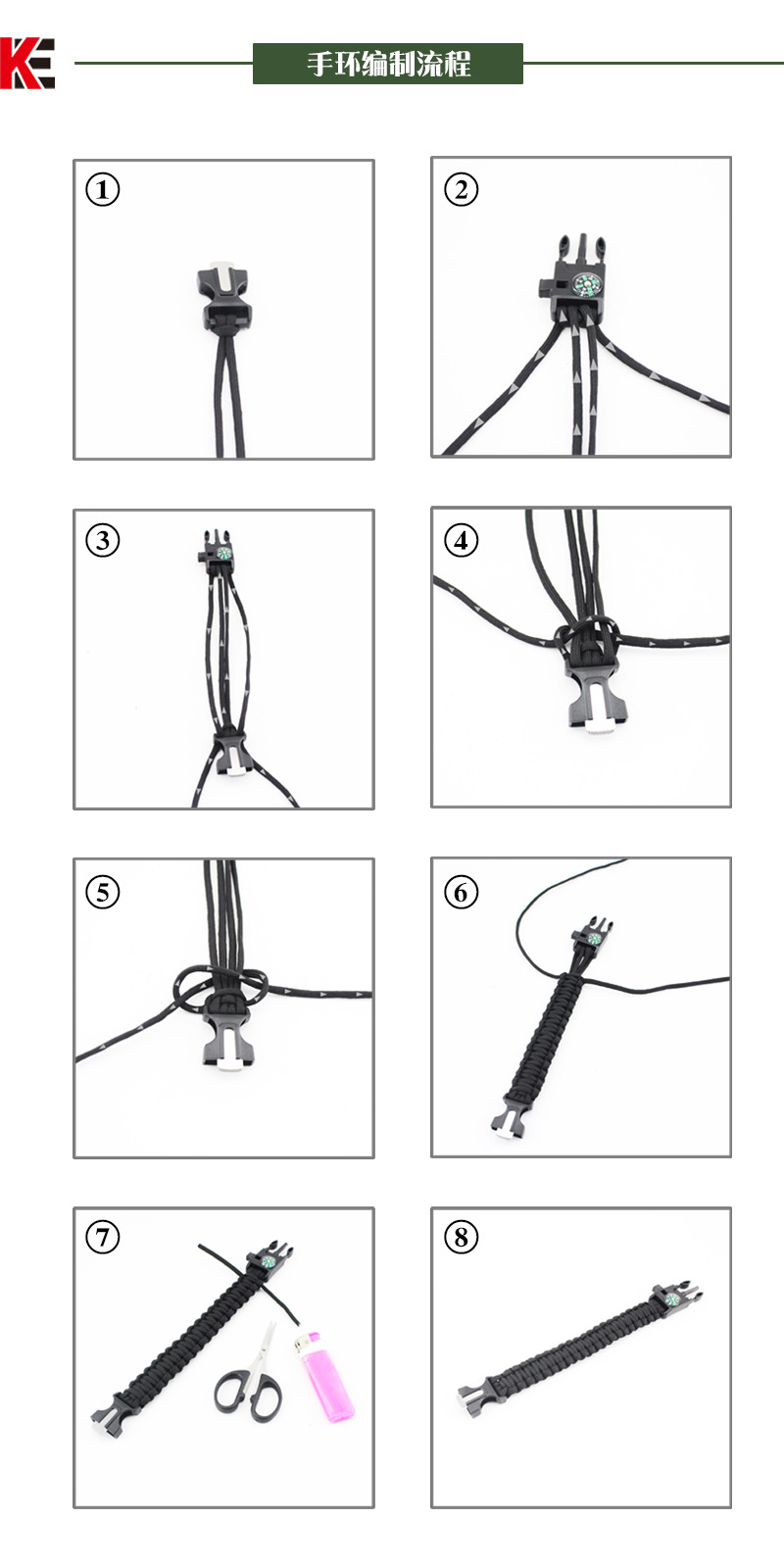 这不是一款普通的伞绳手链,它具有更多户外求生功能。它配备了户外救生取火石,高精度迷你指南针,切绳刀,求生口哨和一根长约3.2米的7芯伞绳,为您的户外探索提供安全保障。