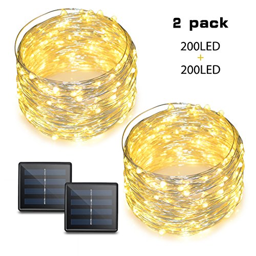 SPECFICATION: 2-Pack 72feet/22meters length, 200LED copper fairy lights with 8 working modes. This solar string light can keep lighting for 8 hours at night if it absorbs enough sunlight (6-8hrs).