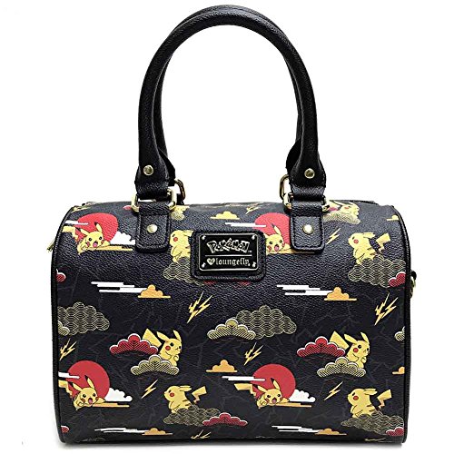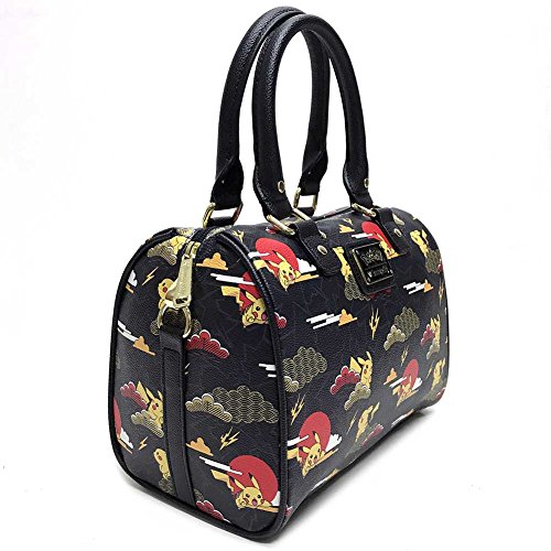 Binding : Apparel Product Description Enjoy the summer's sunset with our Pokemon Pikachu Clouds Duffle Satchel bag from Loungefly. This traditional Japanese art inspired festival bags features full-all graphics of Pikachu playing in the clouds or sun printed on PU leather, logo plaque in front, dual carrying handles, removable shoulder strap, fully lined interior with back pockets, and top zip closure. 0