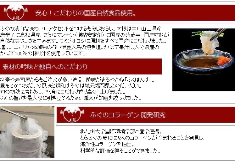 ![]() このページは 「8.ふくのから揚げ 3人前」 のご紹介です | ![]() 1. 銀座ふく太郎・ おもてなしコース 2人前 2. ふく料理ホームコース 3人前 3. とらふぐ刺身古式引き たっぷり4人前 4. 国産とらふぐ刺身 慶祝鶴 4人前 5. とらふぐちりセット 3人前 6. ふくたたき刺身 3人前 7. とらふぐ入りしゅうまい 12個入 8. ふぐのから揚げ 4人前 ![]() |