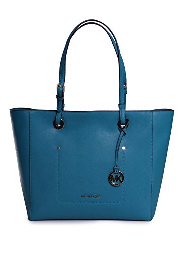 -. Feature : Color/material: peacock leather / Exterior design details: gold-tone hardware, exterior pocket, removable charm / Interior design details: fabric lining, interior pockets / Measures 17.5in wide x 11.75in high x 6in deep / Top handles drop 10in