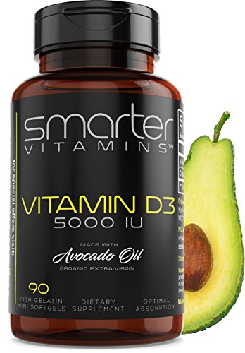 -. Feature : USDA CERTIFIED EXTRA-VIRGIN AVOCADO OIL - Enhanced with Cold-Pressed Avocado oil for super absorption. / NO BOVINE SOFTGELS - Softgels made with fish. / GLUTEN & SOY FREE - SmarterVitamins Vitamin D3 5000 iu is free of artificial colors, gluten, corn, eggs, milk, wheat, peanut, sugar, starch, sodium, lactose, preservatives and soy. / ACTIVE FORM - Our VitaminD3 5000 IU delivers the same biologically active form of vitamin D produced by the body as a result of sun exposure, without exposure to UVB rays.* The Vitamin D Council recommends 5000 UNITS of Vitamin D3 daily for adults to achieve and maintain optimal levels. Vitamin D supports over 3000 cells in your body, bone health, healthy muscle function, immune support and dental & teeth health. / VITAMIN D3 BENEFITS - Vitamin D supports over 3000 cells in your body, bone health, healthy muscle function, immune support and dental & teeth health.
