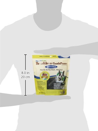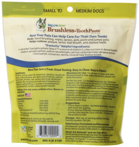 Breath-Less Brushless-Toothpaste may appear similar to other pet dental chew products, however the similarity ends with the look of the products. Breath-Less Brushless-Toothpaste on the outside contains proven breath freshening ingredients and ridges for effective scrubbing. Breath-Less Brushless-Toothpaste on the inside contains Ark Naturals patent-pending toothpaste center for plaque, tartar and bacteria support. Brushless-Toothpaste contains a patented bio-available form of Vitamin C called Stay-C(R) 50. Clinical studies have shown that Stay-C 50 inhibitsthe growth of plaque forming bacteria and supports healthy gums, which therefore creates an additional barrier against bacteria growth. Glucoxidase is a natural enzyme that slows the growth of mouth bacteria and sodium pyrophosphate, an ingredient that disrupts tartar build up.Feature
