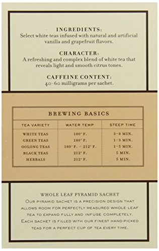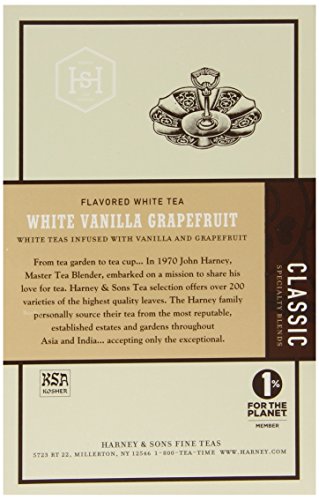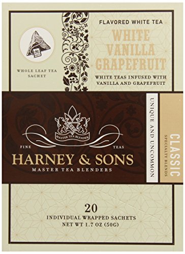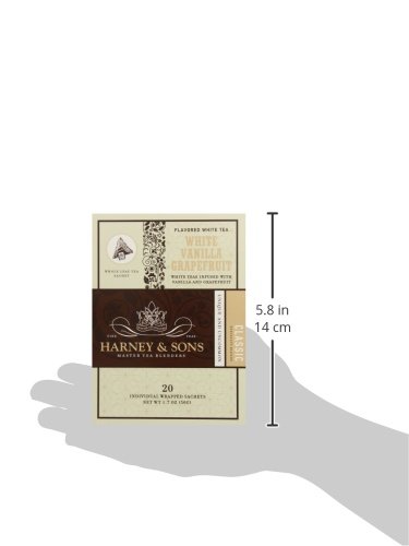 -. Binding : Grocery -. Brand : Harney & Sons -. EAN : 0636046355295 -. Feature : Premium flavored white tea / Infused with vanilla and grapefruit flavor / Whole leaf tea sachets / Kosher / It can be enjoyed on its own or with milk and sugar -. Label : Harney and Sons -. Manufacturer : Harney and Sons -. MPN : 35529 -. NumberOfItems : 6 -. PackageQuantity : 1 -. PartNumber : 35529 -. ProductGroup : Grocery -. ProductTypeName : GROCERY -. PublicationDate : 2014-12-02 -. Publisher : Harney and Sons -. ReleaseDate : 2015-01-20 -. Studio : Harney and Sons -. Title : Harney & Sons White Tea, Vanilla Grapefruit, 20 Sachets (Pack of 6) -. UPC : 636046355295