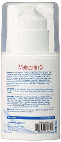 -. Binding : Health and Beauty -. Brand : Allvia -. EAN : 0811590015936 -. Feature : Can use one full press of the pump each day / 3mg of melatonin per pump / Non-greasy and excellent absorption -. IsAdultProduct : 0 -. Label : Nutraceutical Corporation -. LegalDisclaimer : Must be 18 years of age or older to purchase.This product is not intended to diagnose, treat, cure, or prevent any disease. Check with physican before use. -. Manufacturer : Nutraceutical Corporation -. MPN : 64595180034 -. NumberOfItems : 1 -. PackageQuantity : 1 -. PartNumber : 64595180034 -. ProductGroup : Health and Beauty -. ProductTypeName : HEALTH_PERSONAL_CARE -. PublicationDate : 2015-07-20 -. Publisher : Nutraceutical Corporation -. ReleaseDate : 2015-07-17 -. Studio : Nutraceutical Corporation -. Title : Alliva Melatonin Nutritional Supplement, 2 Ounce -. UPC : 811914270256
