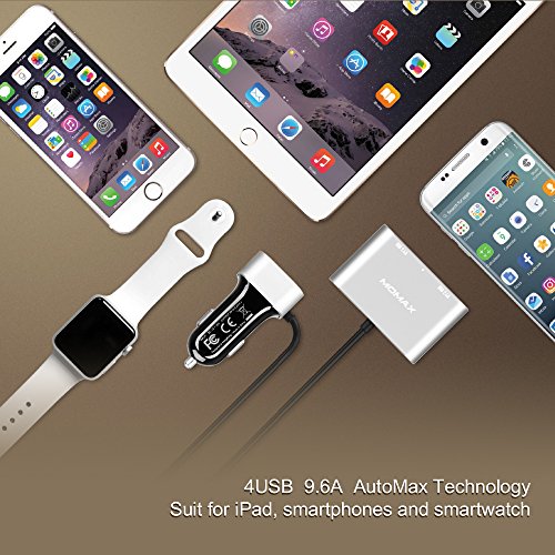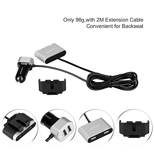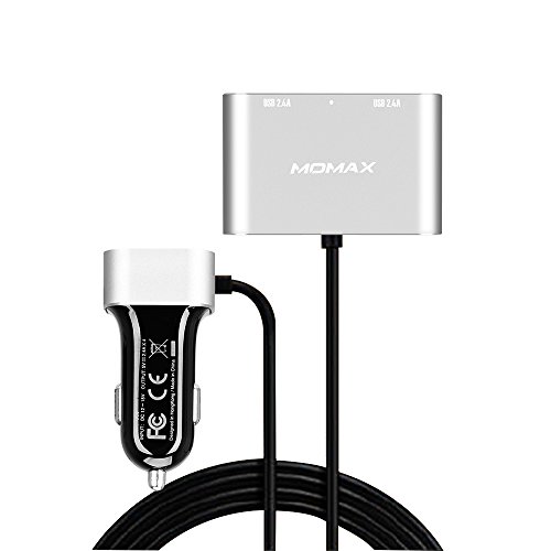 MOMAX 48W 4-Port USB Car Charger, Front/Back Seat with 2M Extension Cable Passenger Car Charger Adapter for iPhone 7 6s Plus, iPad Pro Air mini, Galaxy S7 S6 Edge, Note, LG and More-Silver