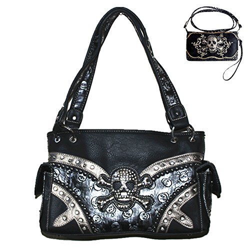 Rhinestone Skull Metal Color Leather Women's Handbag, Wallet with Texas West Coin Collection in 4 Colors.Handbag Size:13''*8''*4'',compartment with zipper inside,zipper on top.2 cellphone pockets,deep pocket,extra pocket with zipper on back for everything easy to get.Matching wallet: 7.5''*4.25''*1''. pocket with 8 credit card slots , ID slots,3 extra large pocket, 3 cash/check pockets with zipper inside. zipper closure on top. Extra hand wrist.High quality rhinestone metal color skull set.Texas west coin collection is included with set. Fast handling and shipping in same business day.Feature