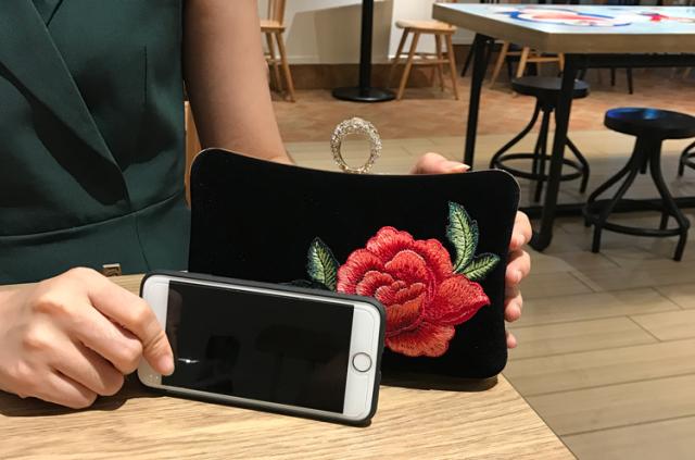 黒字に赤井はなの刺繍が鮮やかなハンドバッグ