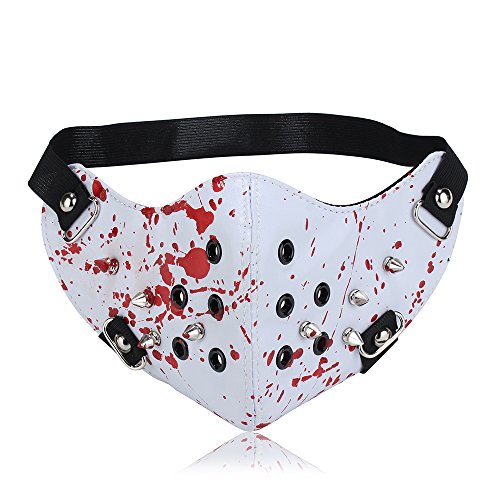 -. Brand : GeDuoYun -. Department : mens -. Feature : Mask Made with high quality leather / Motocycle Mask, Great for both men and women / Suitable for doing activities like biking, riding, snowboarding, or climbing. / With or without blood graffiti to choose from -. ProductGroup : Apparel -. ProductTypeName : ADULT_COSTUME -. Size : One Size -. Title : Leather Rivet Half Face Steampunk Sports Protective Cosplay Motocycle Biker Mask