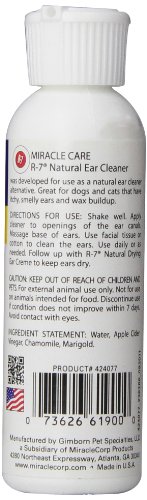 -. Binding : Misc. -. Brand : Miracle Care -. EAN : 0073626619000 -. Feature : Uses ingredients such as chamomile and marigold / Solves the problem of itchy, smelly ears and wax buildup / Especially beneficial for long-eared breeds, swimmers or hunting dogs to prevent ear problems / Gently controls moisture and helps to prevent infection and irritation in your pet's ears / Helps to inhibit growth of parasites, bacteria and yeast -. IsAutographed : 0 -. IsMemorabilia : 0 -. Label : Rich Health -. Manufacturer : Rich Health -. Model : 424077 -. MPN : 424077 -. NumberOfItems : 1 -. PackageQuantity : 1 -. PartNumber : 424077 -. ProductGroup : Pet Products -. ProductTypeName : PET_SUPPLIES -. Publisher : Rich Health -. Size : 4 ounce -. Studio : Rich Health -. Title : Miracle Care All Natural Ear Cleaner, 4-Ounce -. UPC : 073626619000