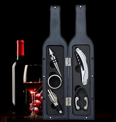 -. Feature : Shaped like a wine bottle, the Wine Accessory Set opens and shuts into place with its magnetic locking mechanism. / A fun and innovative to store and reveal your wine essentials. / A perfect gift for any wine aficionado, the 5pcs Wine Accessory Set makes opening a wine bottle easy, exciting and entertaining. / Great for gift and use in bar, pub, saloon,hotel, restaurant,karaoke or outdoor picnic etc.. / Content includes corkscrew/bottle opener, drip ring, stopper, foil cutter, and combo pourer/stopper.