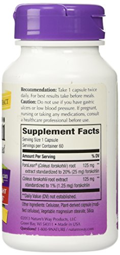 -. Binding : Health and Beauty -. Brand : Nature's Way -. Department : Health and Personal Care -. EAN : 0033674100066 -. Feature : For promoting fat loss lean body mass and weight loss / Sested Use As a dietary supplement Take 1 capsule twice daily / For best results take before meals. - Or as directed by your healthcare professional -. IsAdultProduct : 0 -. Label : Everready First Aid -. LegalDisclaimer : These statements have not been evaluated by the FDA. These products are not intended to diagnose, treat, cure, or prevent any disease. -. Manufacturer : Everready First Aid -. Model : 033674100066 -. MPN : NW1298 -. NumberOfItems : 1 -. PackageQuantity : 1 -. PartNumber : NW1298 -. ProductGroup : Health and Beauty -. ProductTypeName : HEALTH_PERSONAL_CARE -. PublicationDate : 2015-12-18 -. Publisher : Everready First Aid -. ReleaseDate : 2015-12-15 -. Size : 60 -. Studio : Everready First Aid -. Title : Nature's Way Forskohlii Extract Standardized V-Caps, 60 Count -. UPC : 033674100066
