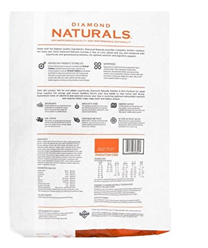-. Binding : Misc. -. Brand : Diamond Pet Foods -. Department : dog-dry-food -. EAN : 0764527057946 -. Feature : Chicken & Rice Forumla for Adult Dogs / Real chicken for superior taste and nutrition. / Guaranteed levels of vitamin E and selenium. / Enhanced with superfoods and probiotics. / No corn, no wheat, no soy. -. Label : Diamond Pet Foods -. LegalDisclaimer : PLEASE NOTE THIS BAG HAS A TEAR IN IT STRAIGHT FROM THE DISTRIBUTOR. IT STILL HAS 100% OF THE FOOD IN IT JUST SLIGHTLY BANGED UP ON TRANSPORT. WILLING TO SEND A PHOTO OF THE TEAR IN THE BAG BEFORE SHIPPING -. Manufacturer : Diamond Pet Foods -. Model : 418312 -. MPN : 418312 -. NumberOfItems : 1 -. PackageQuantity : 1 -. PartNumber : 418312 -. ProductGroup : Pet Products -. ProductTypeName : PET_SUPPLIES -. Publisher : Diamond Pet Foods -. Size : 40 Pound Bag -. Studio : Diamond Pet Foods -. Title : Diamond Naturals Dry Food for Adult Dogs, Chicken and Rice Formula, 40 Pound Bag -. UPC : 074198608201