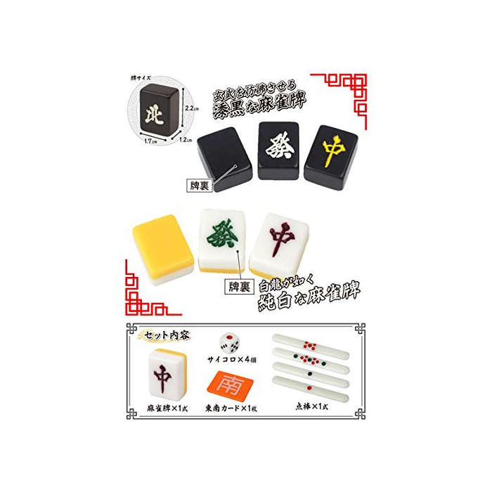 사이즈: 케이스 사이즈:(약)21.7×17.0×2.7cm 패의 사이즈 :(약)W14.3×D12.0×H15.2mm 세트 내용:마작 패 세트,점막대기,주사위,기가마크,전용 케이스 컬러:검정,흰색 ※ 매트는 부속 하고 있지 않으므로,별도 준비 하십시오.
