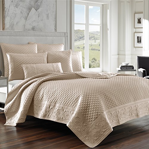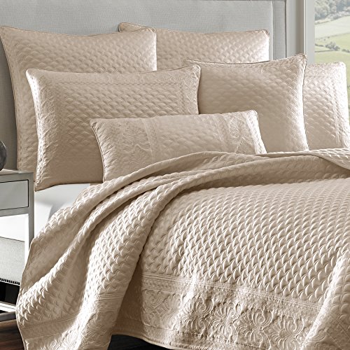 ReleaseDate : 2017-07-03 Studio : Five Queens Court Publisher : Five Queens Court Binding : Kitchen Product Description Add some luxury and update your bedroom with this modern yet traditional Zarah quilt/coverlet. The coverlet's fabric is a matte satin which adds slight sheen to help any bedroom become more noticeable. Available in four complimentary different color ways: White, Pearl, Taupe and Silver. This machine quilted design is bordered with an elegant foulard and damask embroidery, mitered at the corners and edged with a 1/4"self-piping. Available in Full/Queen size 90 x 90 and King size 108 x 94. 0