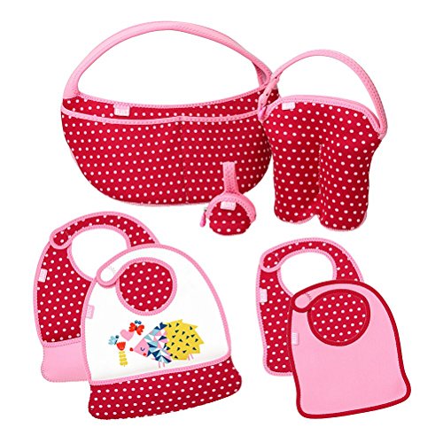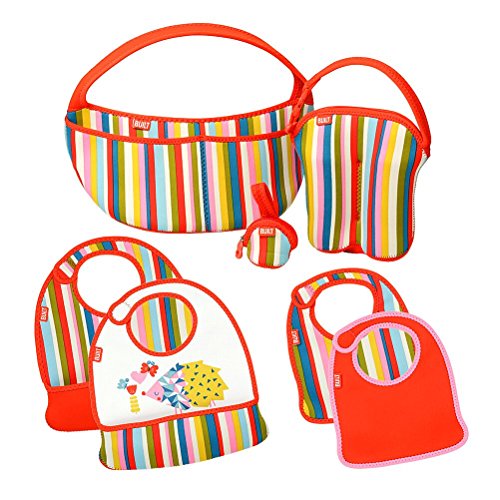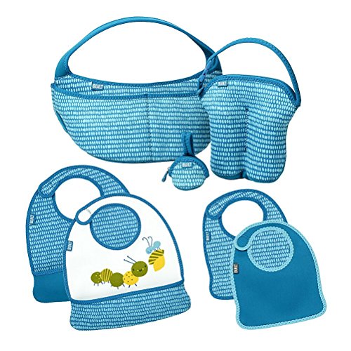 "7 piece set of baby essentials features a 2 bottle carrying tote, a pacifier holder, a set of 2 infant bibs and 2 toddler bibs, and a caddy to organize and carry feeding, bath, or diaper changing materials with ease. Made from neoprene, the iconic wetsuit material and versatile lifestyle fabric, this set is durable, flexible for messy moments, and soft for baby. All items are stain resistant and machine washable, with easy zipper, snap, or Velcro closures. Tested for FDA food safety, lead safety, and phthalates. PVC, BPA, and vinyl-free BOTTLE BUDDY 2 BOTTLE TOTE: Snuggly fits two baby bottles or sippy cups. Insulated for up to 4 hours. Adjustable handle attaches to strollers, handbags, and more. 8"" wide x 8.25"" deep. PACI FINDER SINGLE PACIFIER HOLDER: Keeps a pacifier clean and ready for fussy moments. Snap closure strap is easy to attach to strollers or bags. 3.5"" wide x 5"" deep. SET OF 2 MESS MATE INFANT BIBS: Durable and soft neoprene bibs, with front access Velcro closure for comfortable adjustment. Fits newborns to one year olds. 8"" wide x 9.5"" high. SET OF 2 MESS MATE TODDLER BIBS: Fits 1-2 year olds, with front access Velcro closure for easy adjustment. Crumb catching front pocket offers spill protection. 10"" wide x 10.5"" high. BABY BUDDY ESSENTIALS CADDY: Roomy interior holds all the essentials, whether for feeding, bathing, or diaper changing. Adjustable, removable padded divider insert. Four outer pockets hold creams, toys, bottles, and more. Soft reinforced carrying handle. 15"" wide x 14"" deep. "Feature