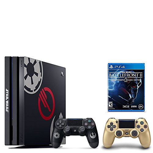 Edition: Pro 1TB - Star Wars Battlefront II Limited Edition Star Wars Battlefront II PS4 Pro Bundle. This bundle will vault you into the greatest intergalactic battles in the Star Wars universe. Featuring a customized Jet Black 1TB PS4 Pro and a matching DUALSHOCK 4 wireless controller, there's no better place to be a hero and dominate the galaxy. Crush the Rebel Alliance, or fight for freedom from the Empire. Dismantle the Resistance, or protect it from the First Order. The choice is yours in an all-new playground of intense galactic struggle. From epic ground assaults to stunning vehicle play and heart-pounding aerial dogfights, dominate every game mode in battles that span across all eras of the Star Wars universe. The Force Is Strong With PlayStation. LEGAL: PlayStation and the "PS" Family logo are registered trademarks of Sony Interactive Entertainment Inc. STAR WARS & TM 2017 Lucas film Ltd. All rights reserved. Game code and certain audio and/or visual material 2017 Electronic Arts Inc. EA, the EA logo, the DICE logo, Motive, the Motive logo, Criterion, and the Criterion logo are trademarks of Electronic Arts Inc.Feature