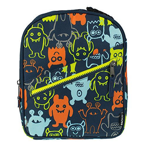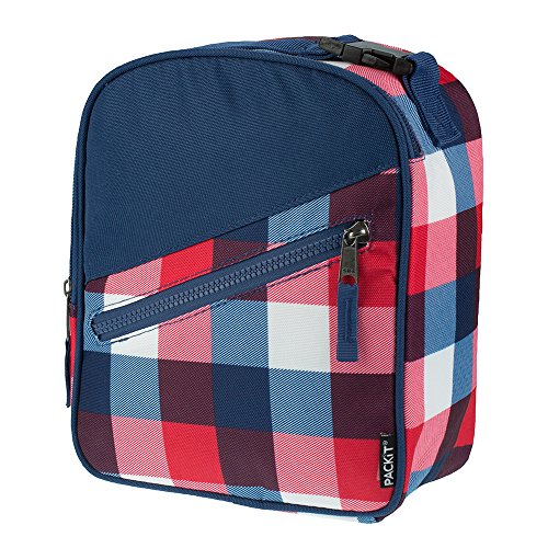 This modern lunch box has it all: a kid-friendly silhouette, a vertical design and groundbreaking cooling technology that chills food and drinks for hours. The secret is freezable gel built into the walls of the lunch box. To use, simply flatten the lunch box and place it in the freezer overnight. In the morning, the walls of the lunch box will be completely frozen and ready to chill items for hours. You'll never waste money or space on separate gel packs or ice packs again! The Freezable Upright Lunch Box easily fits an entire meal and a 12-ounce (340ml) drink. Thanks to PackIt’s cooling technology, you can pack healthy foods that would spoil in other lunch boxes such as dairy, deli meats, salads, fruits and veggies. The lunch box's extraordinary cool keeps items chilled long enough to bring home leftovers, reducing waste and saving you money. A top-load design with a diagonal hinged zipper lets you access items on the go while also securing them inside. Thanks to the vertical design, you can pack taller drinks and keep them upright, which prevents spills. This innovative lunch box also features a slim exterior zip pocket for ID cards or wipes and a buckle handle that clips onto messenger bags, backpacks or sports bags. This soft lunchbox is made from nontoxic poly canvas and has a food-safe, water-resistant lining. Like all PackIt products, the Upright Lunch Box is made from PVC-, BPA-, phthalate-, formaldehyde- and lead-free materials. PackIt’s Freezable Upright Lunch Box measures 8.5 inches tall, 10.25 inches wide and 4.75 inches deep while open. When flattened, it measures 10.25 inches wide, 8.5 inches deep and 1.75 inches tall for easy storage in the freezer. Simple care: wipe thoroughly or hand wash the interior and spot clean exterior; allow bag to dry completely before freezing. Not machine or dishwasher safe.Feature