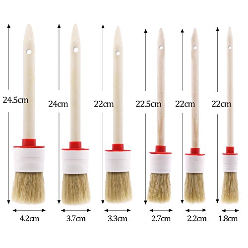 -. Feature : ★ ASSORTED SIZES --- We have preparded 6 SIZES brushes for you, these different sizes brushes will can meet all you needs. You can choose any one to suit your needs, enough length for easily exploring and reaching into the lug nuts, narrow or tight space. / ★ HIGH MATERIAL --- These brushes are made of boar hairs, The tip end of each bristle is naturally split into two or more branches called the flag, That makes brush softer and they are relatively scarce and expensive. So definitely, these are tools every detailer must have. / ★ DURABLE AND LONG LASTING BRISTLES --- Our detail brushes are designed to meet the demanding needs of car care enthusiasts and professionals. / ★ GOOD WORKING --- Wooden handles are lacquered, so humidity will not crack the handles as wood tend to. This car detailing brush set is great for everything from getting crumbs out of your seat crevices to dusting air vents or washing emblems. / ★ PERFECT SIZE FOR ANY JOB --- The 1.25" large diameter head and 2'' long bristles are a perfect fit for everything from lug nuts to interior vents. The 8'' long handle helps with tough-to-reach spots.