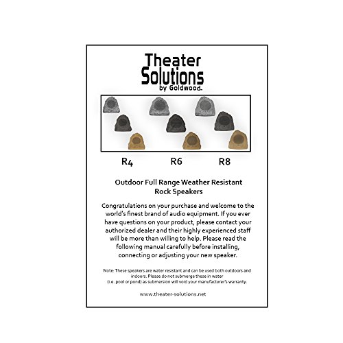 Theater Solutions R4G indoor or outdoor weather resistant granite grey speakers, recommended power is 10-125 watts per speaker, efficiency is 94dB, frequency response is 80Hz-20 kHz