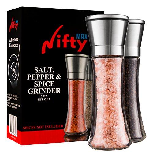 - BRUSHED STAINLESS STEEL DESIGN WITH HIGH QUALITY GLASS - NiftyMax Salt & Pepper Mills are made of brushed stainless steel with an easy to refill clear glass body, which allows you to see the contents of the mill, letting you easily control the quantity. Just a few grinds with NIFTYMAX grinders will deepen the flavors of anything that comes from your kitchen ! Simple & modern design with no logos or branding that will look elegant & smart on your table at all times and charm your family & guests.