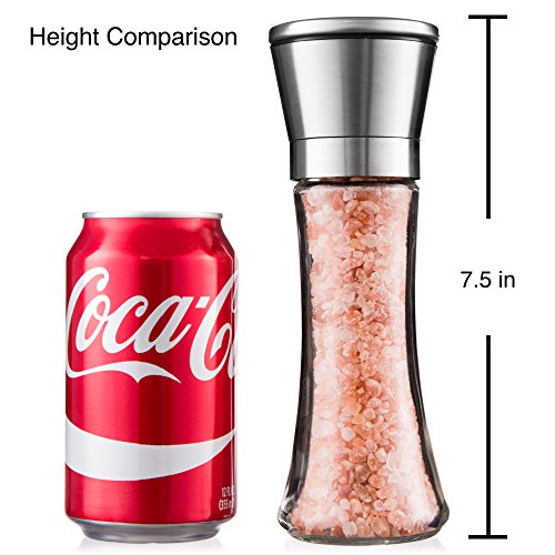 - LARGER CAPACITY, FEWER REFILLS – Our Salt and Pepper grinders are 7.5 inches tall & 2.5 inches wide. Each salt and pepper grinder will hold up to 3/4 cup or 6 OZ of your peppercorn, sea salt, himalayan salt, kosher salt, pink salt, and/or spices of your choice. Effortlessly twist with your hand to transform simple foods into something remarkable! Our firmly closed grinders contain a sealing lid keeping your spices fresh and away from moisture & dust and free of undesirable residues on your table