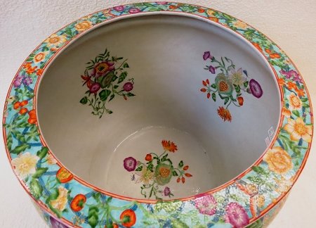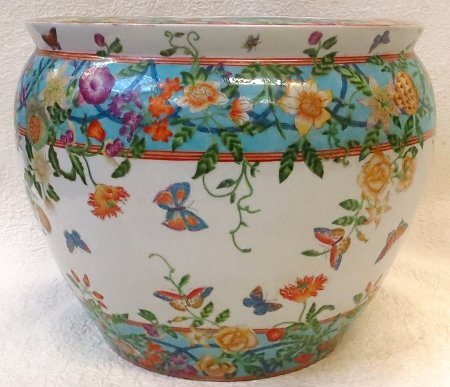 Product Description Butterflies and flowers decorate this Chinese porcelain fishbowl in bright spring colors. The porcelain fish bowl measures 18 inches across the top of the rim and is the perfect porcelain fishbowl for your plants. 0