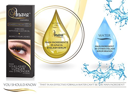 - AN ALL NATURAL FORMULA: The Anava eyelash growth serum is made with 100% natural ingredients. More specifically, the eyelash treatment serum is made with `Castor oil, Coconut oil, Vitamin E and Soybean oil. These pure ingredients will penetrate deep into the skin of your eyes and work from the inside out. Your eyelashes will become softer, shinier, thicker and healthier. Plus, your eyes will be safe from dandruff or other fungal infections. Anava is the safest choice!