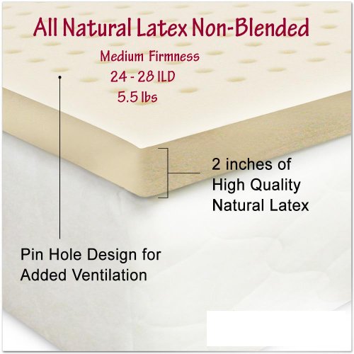 -. Feature : Natural latex topper, pure and no chemical additives, with medium firmness (24-28 ILD) 2 Inch thick. All natural latex toppers made from eco-harvested rubber tree with medium firmness 2 Inch thick. Our best seller. / Adds a layer of comfort and support with purity associated with organic products. No chemical additives. Sleep well with no fear of toxic off gassing. / Comfort design with air ventilation, resilience and pressure points elimination for deep comfortable sleep. / Always pure, anti-microbial, hypo-allergenic, dust mite resistant, anti-fungal and very durable. / Sizes: Twin - 38x75, Twin XL - 38x80, Full - 53x75, Queen - 60x80, King - 76x80, Cal King - 72x84