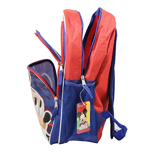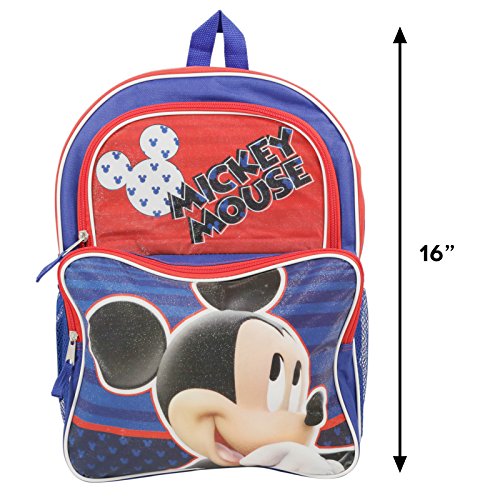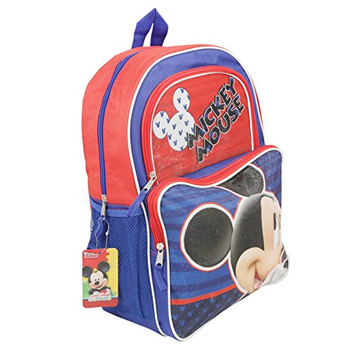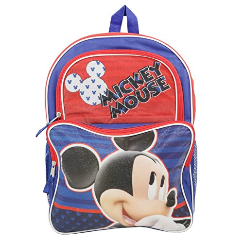 This backpack has amazing detailed graphics of Disney's Mickey Mouse that adds style to your kids back to school style! Features Mickey and the classic Mickey Mouse ear logo on a sparkly background. With adjustable shoulder straps and top carry handle, it makes for a comfortable, fitting, and durable backpack. Includes two mesh pockets and a zippable front compartment. Backpack is roomy at 16 inches, so it can carry all the necessary back to school supplies! The bright red and blue primary colors ensure the backpack and your child will be easy to spot, as well as look sharp!Feature