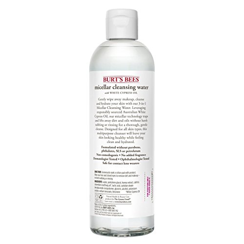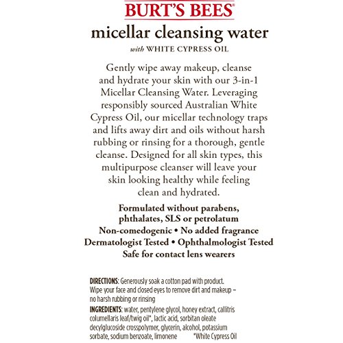 -. Feature : One 12 ounce bottle of Burt's Bees Micellar Cleansing Water is a detergent free liquid that removes makeup, cleanses and hydrates skin in one easy step / 3 in 1 Micellar Water is formulated with Australian White Cypress oil and honey extract to gently remove lingering makeup, gently cleanse away pore-clogging dirt and oil while nourishing your skin / Micellar Cleansing Water will make your skincare regimen a breeze, simply soak a cotton pad and wipe away dirt, oil and makeup without harsh rubbing or rinsing / Non-comedogenic botanical blend of cleansing and softening ingredients are gentle enough to use twice a day to clean and tone your skin, leaving it feeling naturally hydrated and revitalized / Cleansing Water is made with 99.5% natural ingredients, dermatologist and ophthalmologist-tested and contains no fragrance, no parabens, phthalates or petrolatum