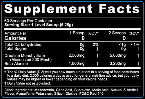 A ONE-TWO PUNCH COMBO OF CREATINE AND BETA-ALANINE - We took it up a notch by not only offering 5,000mg of micronized creatine monohydrate at its maximum dose, but also including 3,200mg of Beta-Alanine. Beta-alanine promotes higher energy levels, better endurance, and an improved overall athletic performance.