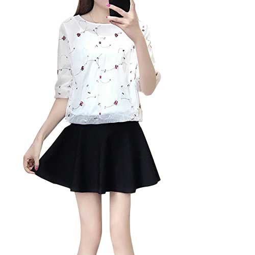 -. Title : レディース ツーピースドレス シフォン Aライン ミニスカート 無地 総柄 半袖 カットソー 小花柄 ラウンドネック きれいめ 大きいサイズ 清楚 エレガント 大人可愛い フェミニン オフィス デート お出かけ ホワイト×ブラック