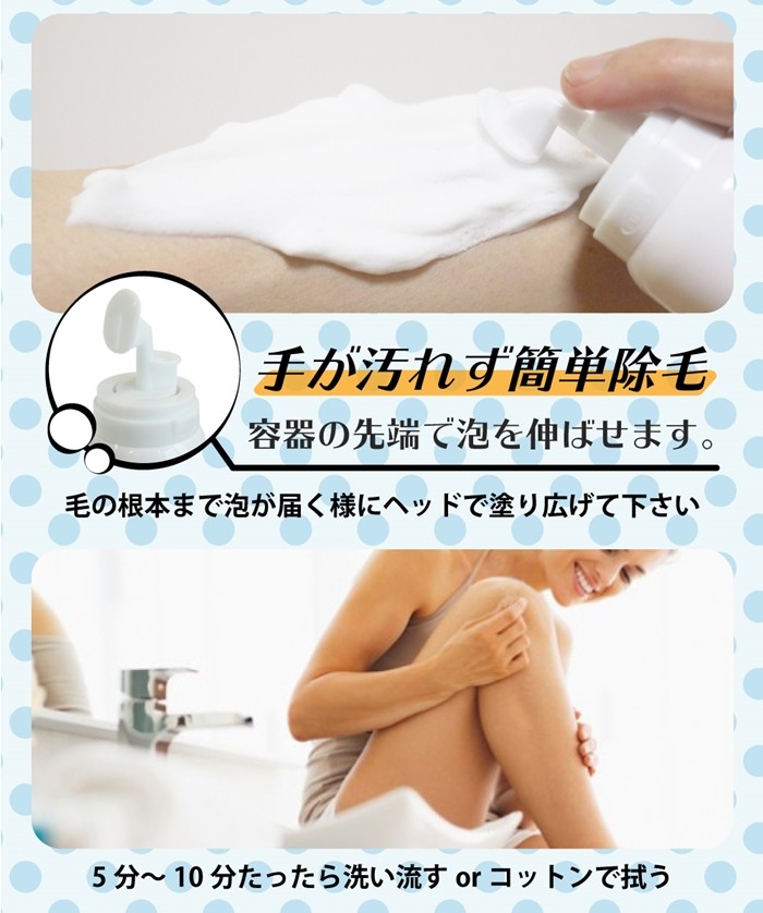 缶を斜めにした状態では使用しないでください。②除毛したい部分に1cmくらいまで近づいて毛の根元をおおうようにムラなく塗ります。③そのまま5~10分おいた後、ティッシュなどで拭き取り、水かぬるま湯で洗い流します。指定の時間内にきれいにとれなかった場合は、2・3日おいてからお使いください。④除毛後は乳液やクリームでお肌を整えてください。