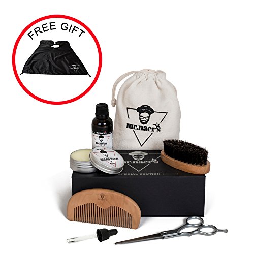 MR.NAER'S Beard Care Kit Beard Moustache Grooming Trimming Set with Bonus Beard Cape Apron-Growth and Shaping Set-Organic Nutrient Oil,Balm,Steel...