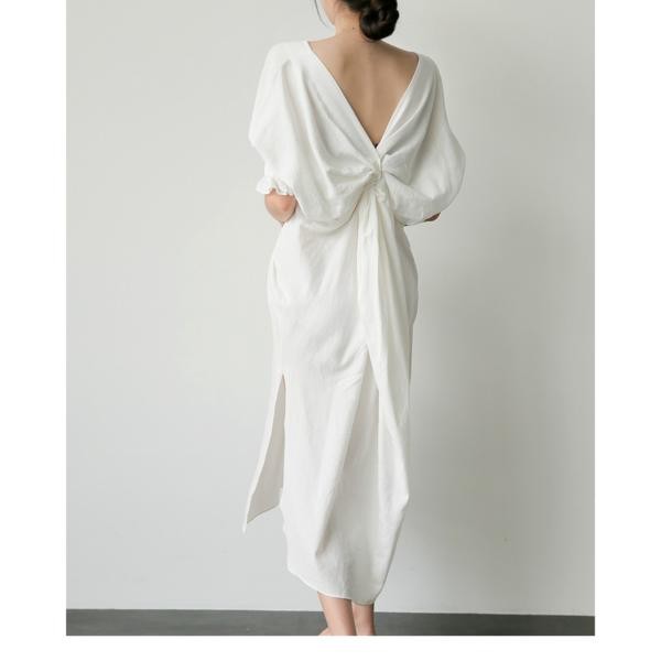 おしゃれ☆バックドレープデザイン Vネック パフスリーブ サイドスリット ワンピース