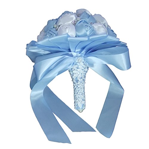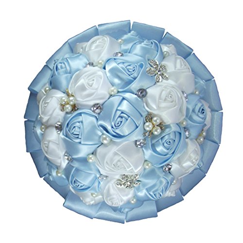PYJTRL Multicolor Crystal Pearl Wedding Bridal Bridesmaid Ribbon Bouquets (Light blue + white)