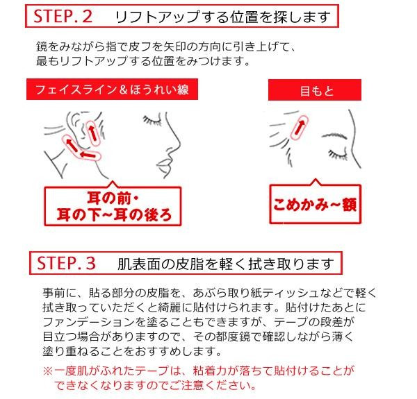 | 医療用極薄テープを使用しています。目立ちにくく、一日中たるみ知らずの若々しいフェイスラインに。こだわりの日本製です。 |