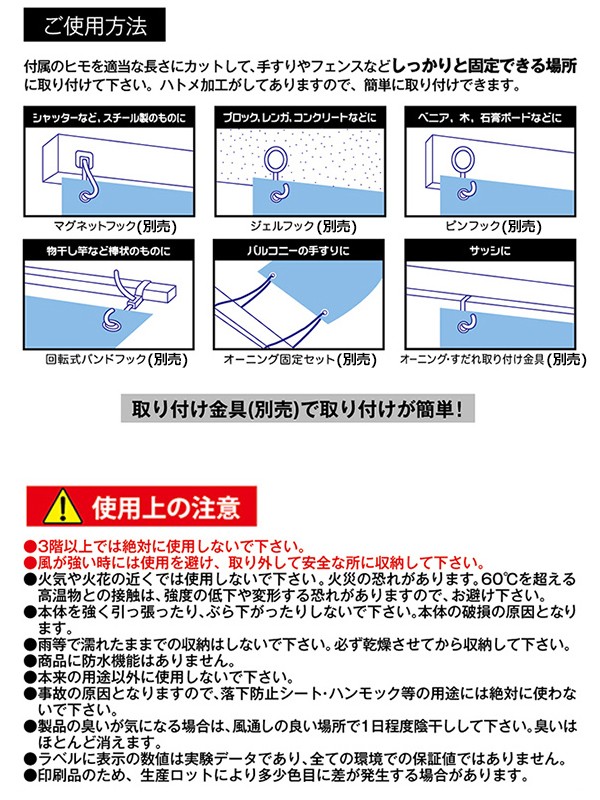 お庭やテラスでの日差し対策に最適です。上下ハトメ加工ですので、付属のひもを使って色々な場所に簡単に取り付ける事が出来ます。 |
