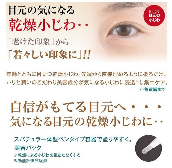 ハリと潤いのこだわり美容成分が、気になる乾燥小じわに浸透(角質層まで)し、集中ケア!!スパチュラ一体型ペンタイプ容器で塗りやすく、目元だけでなく、口元のケアにもお使いいただけます♪朝起きてはがすパックタイプ。 |