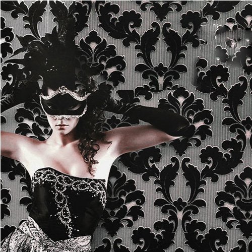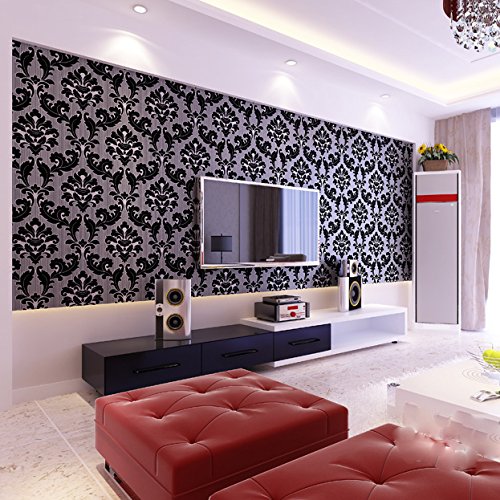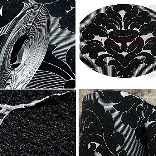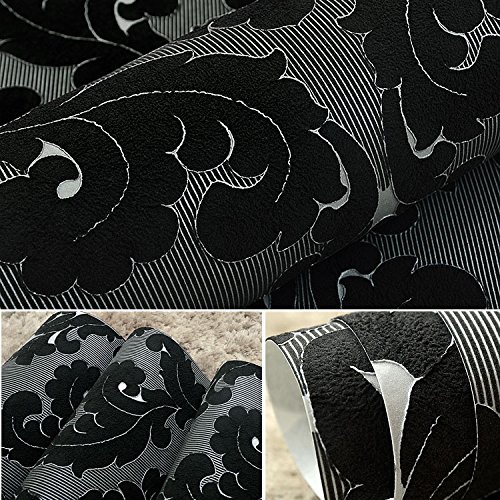 QIHANG Luxury Extra-thick Non-woven 3D Dimensional Flocking Damask Embossed Wallpaper Roll Black Color