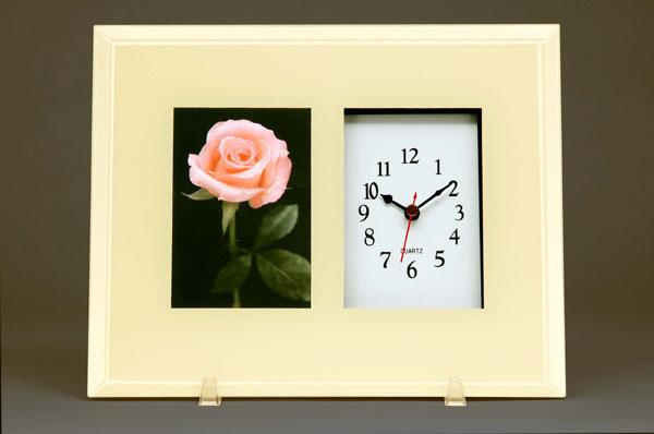 シンプルなデザインと、どんなインテリアにも馴染むナチュラルカラーのガラスフォトフレームです。見やすい大きな時計が印象的です。