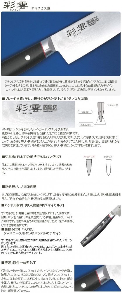 | 素材・材質 | 刃:芯材VG-10のダマスカス鋼 柄:マイカルタ |