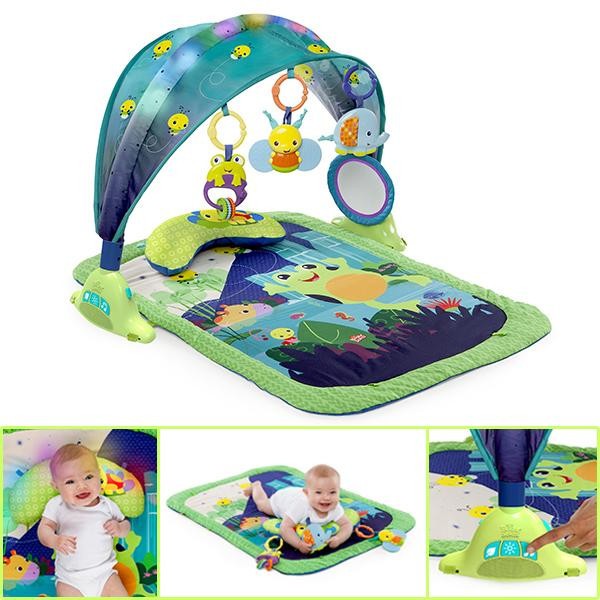 トイバー上にカラフルな光が現れ、川のせせらぎや虫の声、葉っぱの揺れる音などの心地よいメロディとともに、赤ちゃんを楽しませます。赤ちゃんはライトショーを見ながら、遊んだり、ねんねしたりすることができます。 |