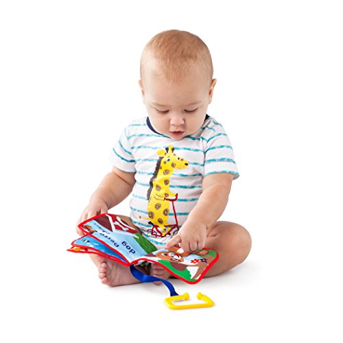 It's the perfect first book for baby. Complete with four engaging fabric pages that make crinkle sounds, real-life imagery and educational content. The Baby Einstein Explore & Discover Soft Book provides a handy link loop that allows you to attach it to car seats, strollers, and more for on-the-go fun.Feature