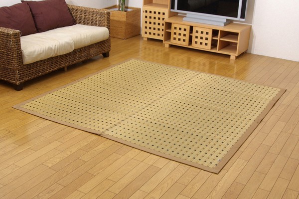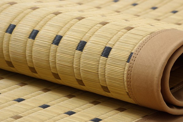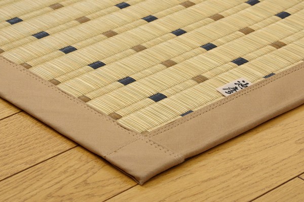 掛川織は九州筑後地方の伝統的な織り方です。大きな目と小さな目に交互に織り込んだ美しく洗練されたモダンなデザインが人気です。また、厳選された良質の太く長いイ草を高密度に織り込んでいますので、丈夫で耐久性があり、しかも素足に心地よいクッション性とボリューム感があります。国産のい草を使用しています。一本一本が太く、表皮が厚く繊維がキメ細かいので弾力性があり、耐久性に優れています。い草には空気の自然浄化作用、湿度の調節作用などがあります。また汚れにくく、使用するうちに黄金色に変化し味が出ます。フローリングを傷つけにくいよう裏には不織布を貼っています。い草に青森ヒバ加工を施しています。(抗菌、防臭効果)