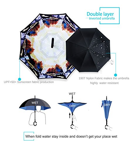 -. Feature : ☂ 1. ANTI-ULTRAVIOLET - UPF>50+ Sunscreen fabric production, Double layer protection, Light transmittance is "0". / ☂ 2. HANDS FREE - Great for phone user and mothers, Cross the C-shape handle over your arm, made you hands free for holding a baby, bag or mobile if needed. / ☂ 3. DRIP FREE - Creative investing design, inside-out design prevents water from dripping, keeping floors and cars dry. / ☂ 4. INVERTED DESIGN - The surface of the umbrella cloth wet will cleverly folded. So it won't get wet when you get in or out of the car. / ☂ 5. DOUBLE PROTECTION - Windproof and UV proof, Inverted Reverse umbrella, Protect you from wind and rain or sun at anytime.