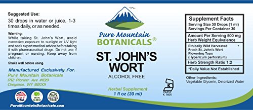-. Feature : POTENT: Made from Ethically Wild Harvested St. John's Wort flowering tops only. This herb must be picked while flowering and only the tops are considered the most potent - Beware lower quality alternatives that use other parts of the plant. / TRUSTED: Our Saint Johns Wort Liquid is KOSHER, VEGAN and GLUTEN FREE. Made with NO Harsh Preservatives or Fillers. NO Potassium sorbate, NO Sodium Benzoate, NO GMOs / MADE IN USA: FDA registered, GMP and Kosher certified facility to ensure the highest quality, potency and consistency every time. / MONEY BACK GUARANTEE - Try the Best - Risk Free! These St Johns Wart Drops and ALL Products from Pure Mountain BotanicalsTM are covered by a no-question asked money back guarantee.