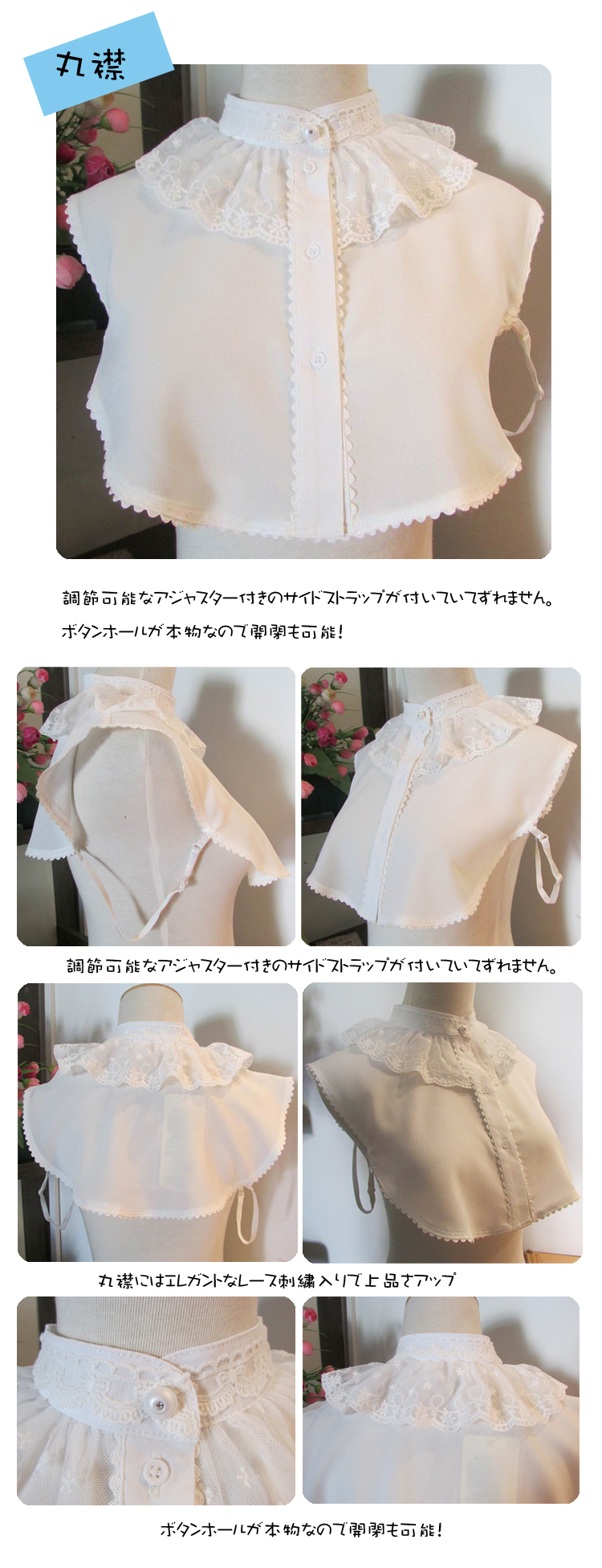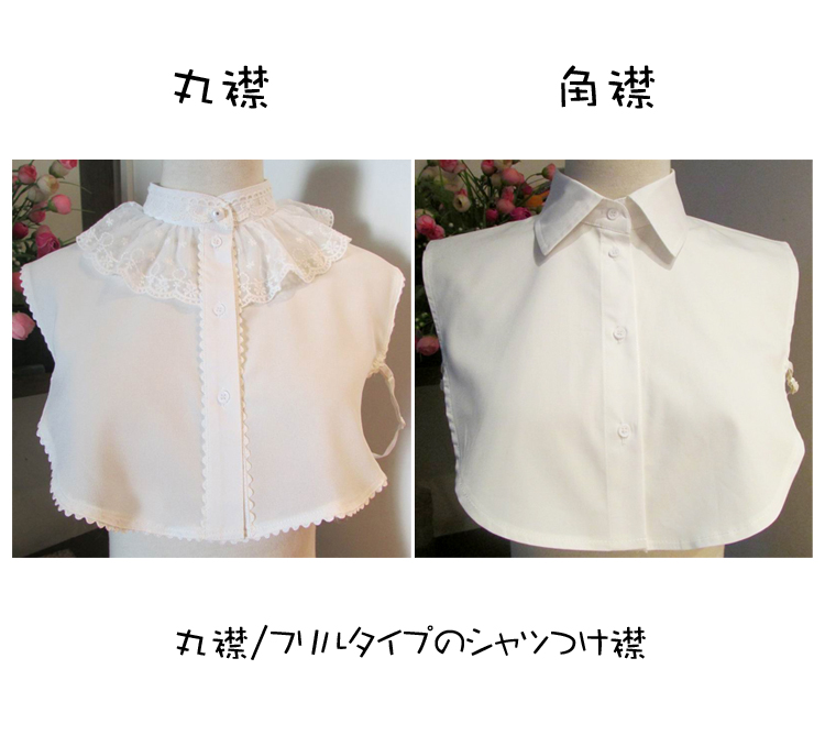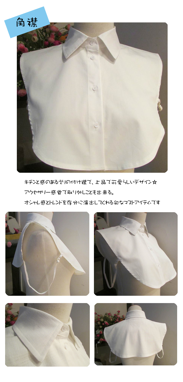 | 丸襟/フリルタイプのシャツつけ襟 調節可能なアジャスター付きのサイドストラップが付いていてずれません。ボタンホールが本物なので開閉も可能!キチンと感のあるえりの付け襟で、上品で可愛らしいデザイン☆アクセサリー感覚で取り外しことも出来る。オシャレ感とトレンドを存分に演出してくれる旬なマストアイテムです? ロンTやニット、ワンピースなどの下に着ることですぐにレイヤードスタイルが完成し、グッとオシャレに◎ごわごわしないのでスタイルもすっきり!! | |