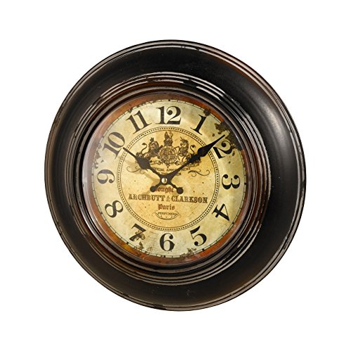 This antique reproduction clock has been created with such craftsmanship, people won't believe it's battery operated! The glass encased face of the clock features a beautiful crest with the name of a perfumer and their location in Paris. Encased in round brown metal frame has that has a weathered look and gives this piece the charm of a cherished heirloom. Anyone could imagine this lovely clock hanging in a chic antique shop in Paris!